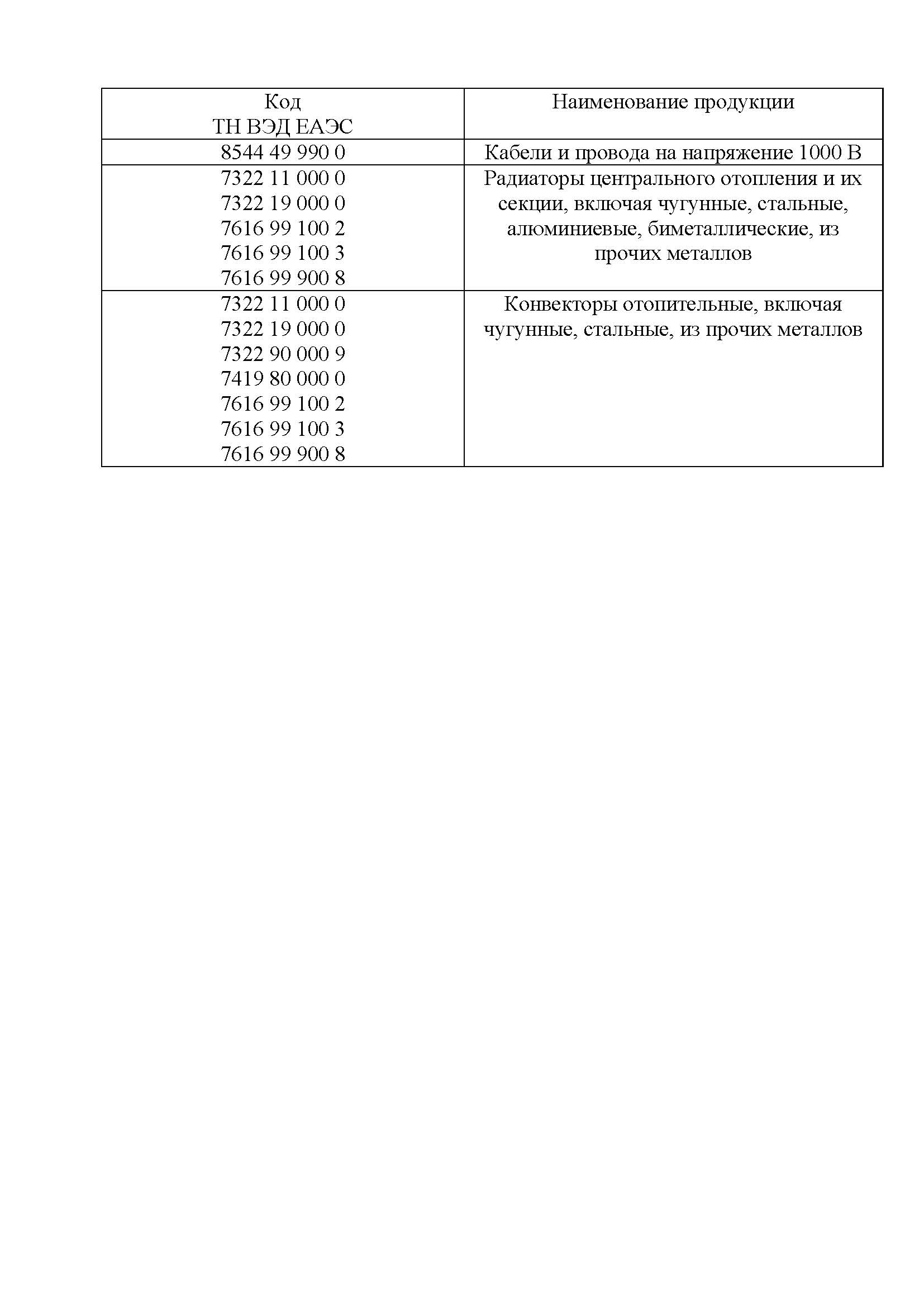 Во исполнение поручения Минпромторга России предлагаем участникам оборота отдельных видов кабельно-проводниковой продукции и участникам оборота отдельных видов отопительных приборов, в том числе производителям и импортерам продукции, классифицируемой в соответствии с кодами единой Товарной номенклатуры внешнеэкономической деятельности Евразийского экономического союза (ТН ВЭД ЕАЭС), указанными ниже, принять участие в эксперименте.